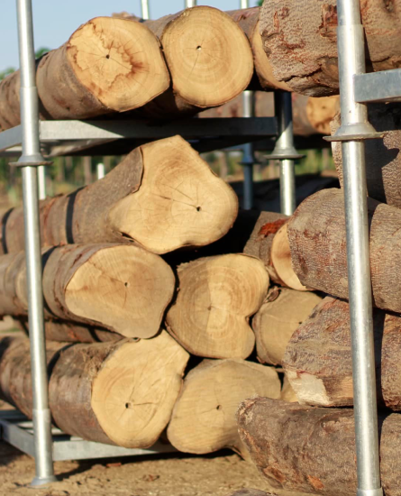 Die schöne Struktur und das Aussehen des Holzes ermöglicht es, sein Aussehen in eine Vielzahl anderer Holzarten zu verwandeln, u.a. in Teak, Mahagoni und andere, oft viel teurere Holzarten. Da wir den Baumstamm 6-7 Meter 'astfrei' wachsen lassen, ist es auch das perfekte Holz für die Herstellung von Furnier in verschiedenen Farben und Erscheinungsbildern.