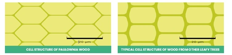 The wood is known as the ‘Aluminum of wood’, the ‘Lightweight Champion’. Its honeycomb cell structure (please see the illustration below) gives the wood its durability, flexibility and uniquely high relative strength despite its light weight - compressive strength along fibers - 281 kg/m³. The scientists at WeGrow, Germany enhance these qualities further, utilising highly specialised tissue-culture technologies, in order to achieve structured growth throughout the entire cycle, from seedling-to-harvest. This makes our wood unique.