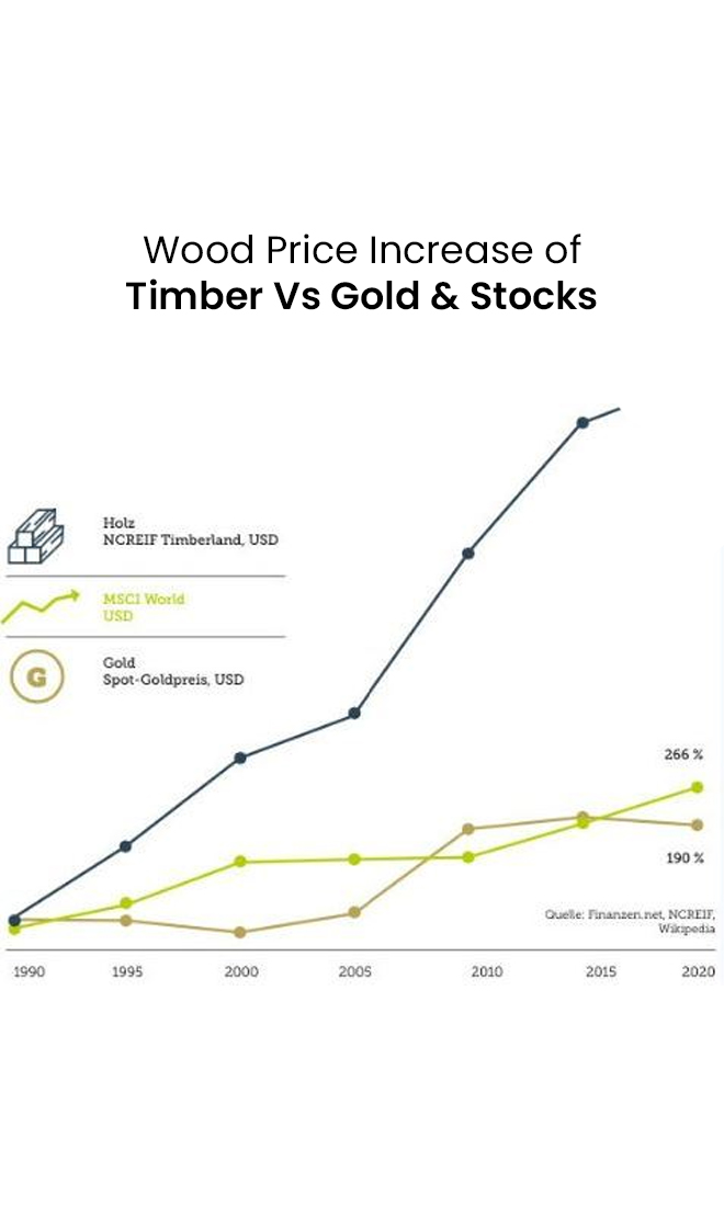 Explore our exclusive and fully managed plantation that provides not one, but three income streams with attractive returns!The demand and price of wood, especially high quality wood, is continuously increasing, for generations (please see the statistic of wood price development from 1990 vs gold & stocks, left side). This constant and well established fact is further advancing now, since the following factors are culminating in current times: